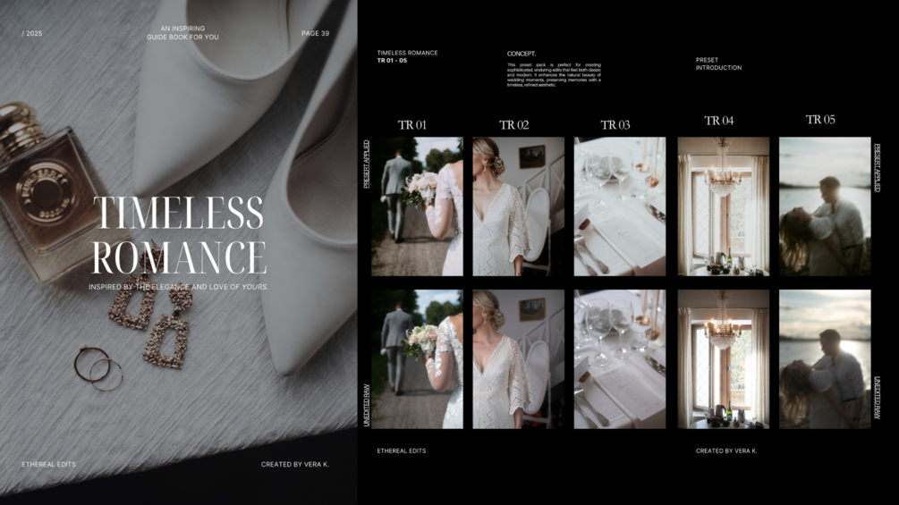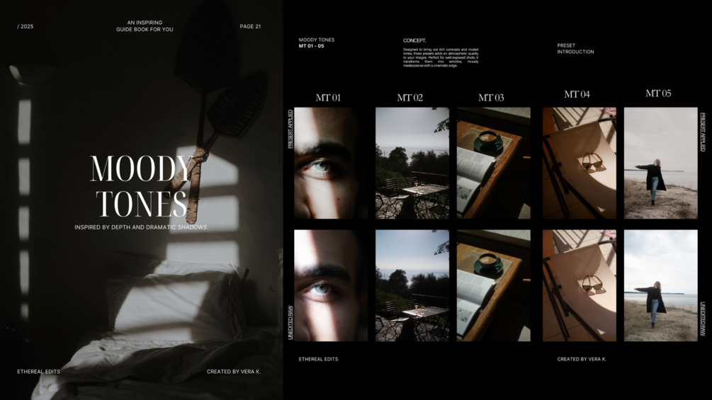 Transform your photos with Ethereal Edits, a carefully curated collection of 40 presets across 8 unique themes, designed to bring timeless beauty, natural tones, and effortless elegance to your images. Perfect for photographers, creatives, and content creators, this all-in-one pack includes an inspiring guidebook with an installation guide, preset introductions, and expert editing tips. / © Vera K. 2025