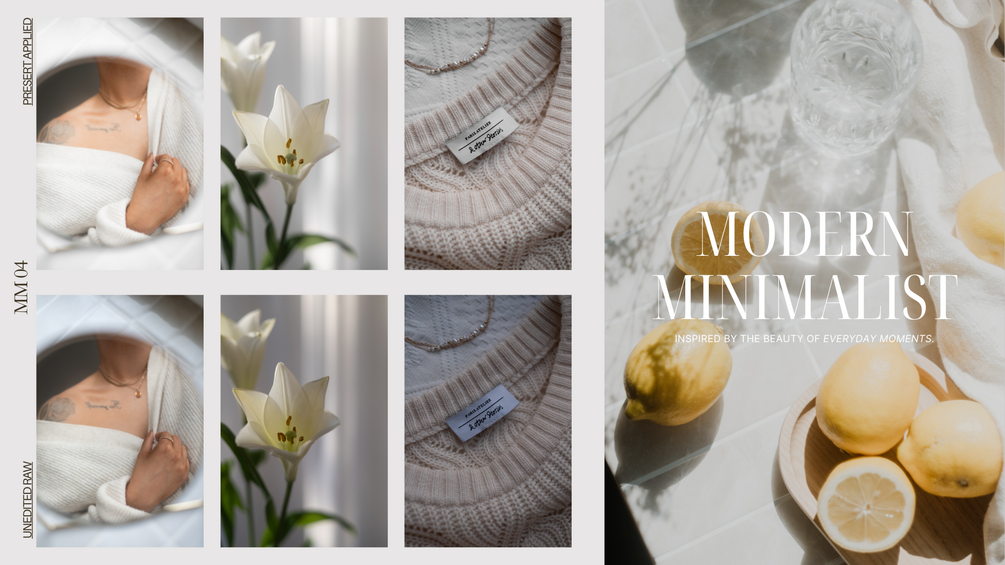 This preset enhances the subtle elegance of neutral tones and airy highlights, creating a clean aesthetic. Perfect for capturing the simplicity of life’s quiet, beautiful details. Ideal for neutral and bright shots, it celebrates minimalism with a soft, timeless touch.